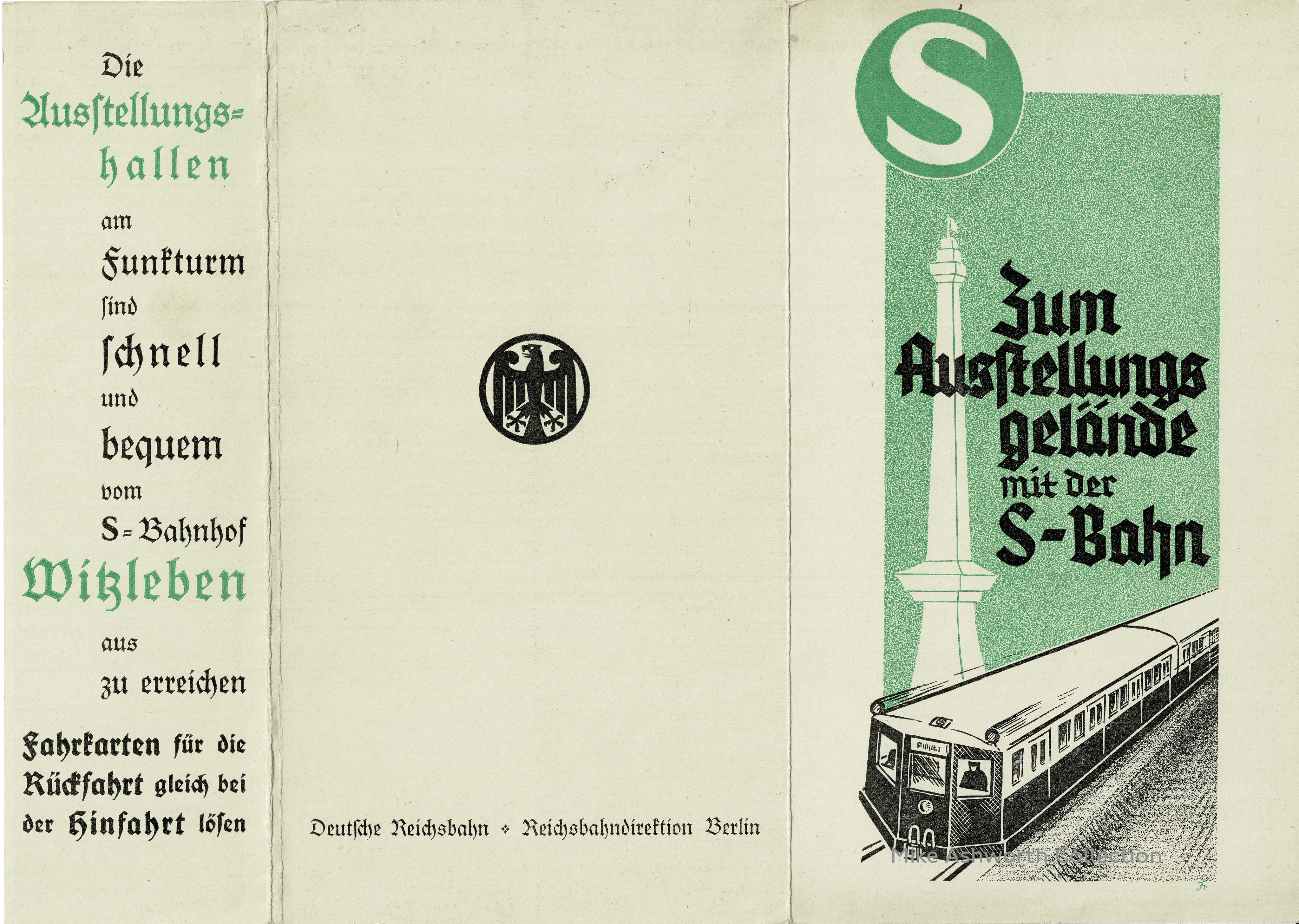 A folder advertising Third Class fares on the Berlin S-Bahn to visit the exhibition grounds and Funkturm adjacent to the city’s S-Bahn station at Witzleben. The diagram is interesting in that the system’s stations include the Third Class (3. Klasse) fare to Witzleben from the station of origin.