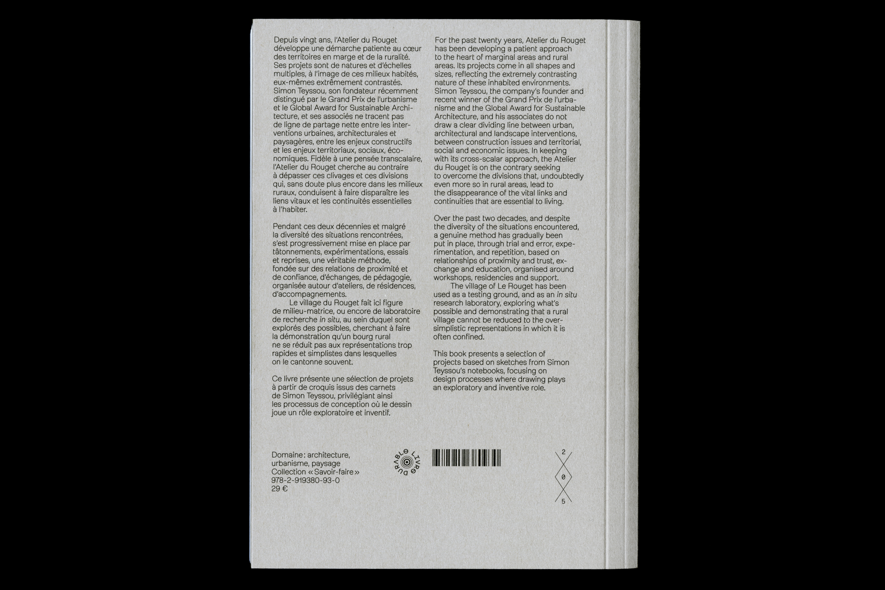 For the past twenty years, Atelier du Rouget, founded by Simon Teyssou, has developed a patient, cross-scalar approach to marginal and rural areas, addressing architectural, urban, landscape, and social issues as interconnected rather than separate, with the aim of preserving vital links essential to living environments. Using the village of Le Rouget as a testing ground and in situ research laboratory, Atelier du Rouget demonstrates the complexity and potential of rural territories beyond simplistic representations, and this book presents a selection of projects drawn from Simon Teyssou’s sketchbooks, highlighting drawing as a key exploratory and inventive tool in the design process.