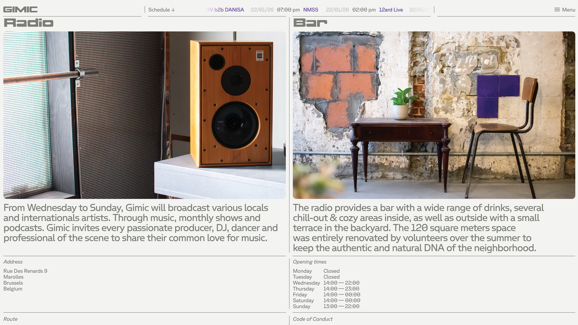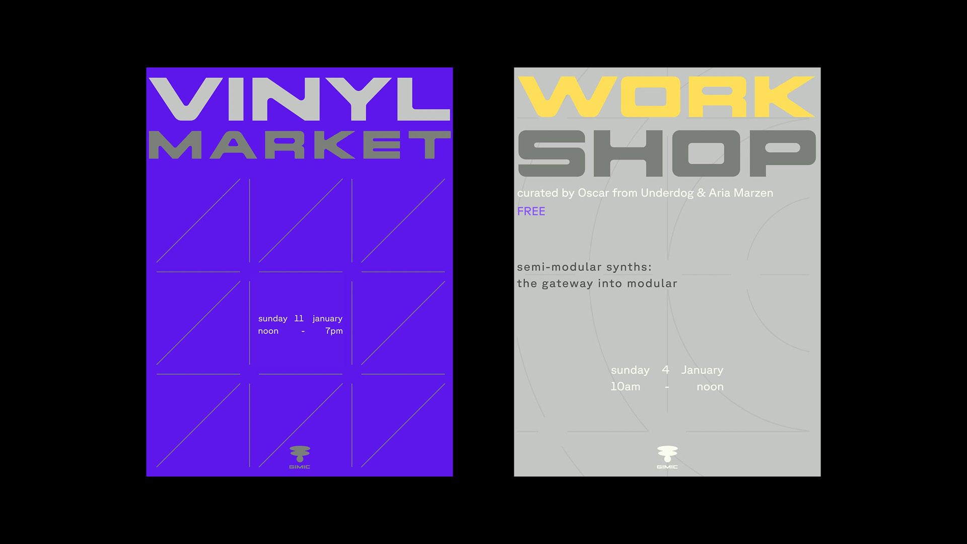 Located in Brussels’ Marolles district, Gimic is a bar and radio station whose mission is to foster the electronic music scene of the city. On their Instagram page, which has amassed over 23k followers as of January 2026, they chose to use DOSS Exaflop from the Doss Collection by Marc Rouault, available at Sharp Type. The typeface was also used for their main wordmark, often paired with an abstract purple icon. Emulating the futuristic soundscape of electronic music and infectious DJ sets, their team uses the typeface for promoting in-person events such as holiday markets, workshops, and new release events.
