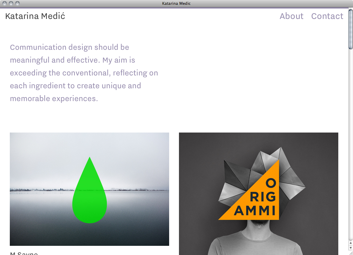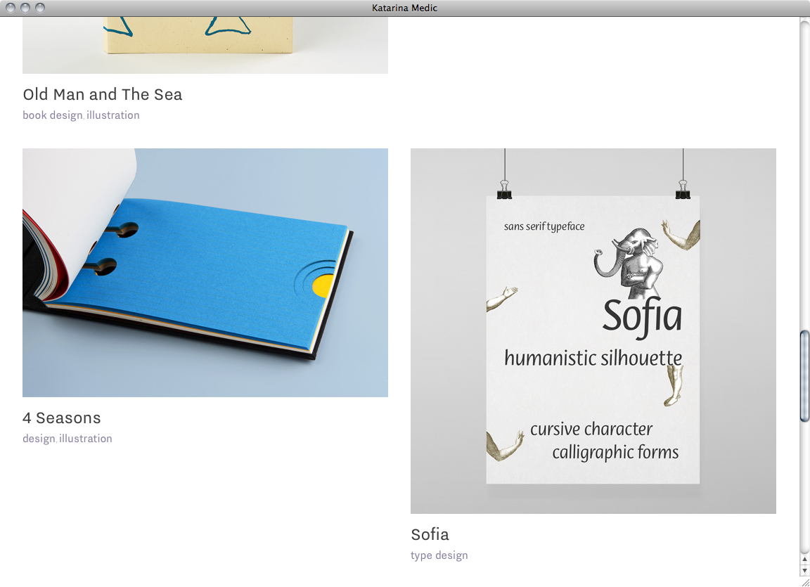 Katarina Medić website Contributed by Webtype on Sep 18th, 2014. Artwork published in circa 2014. License: All Rights Reserved. London based communication designer Katarina Medić presents her work on a clear portfolio website where Nitti Grotesk is used exclusively affirming her stance on effectiveness in design. License: All Rights Reserved. License: All Rights Reserved. License: All Rights Reserved. Typefaces More about Nitti GroteskGet Nitti Grotesk Formats Web (5565) Topics Graphic Design (2985) Designers/Agencies Katarina Medić (1) Tagged withportfolios (760)one typeface (1746)white (46) Artwork location United Kingdom (3263) London (1805) In Setspf (Karo Konieczna) (61)Webtype (Webtype) (241) Post a comment Name Email – will not be published Website Your response Submit Comment More Nitti Grotesk in use Bart van Lieshout website (2018)2018Bart van LieshoutContributed by Bart Van Lieshout Leira2022LeiraContributed by Inès Davodeau Büro Brux2019Oliver BruxContributed by Oliver Brux Sponsor More in Graphic Design Zuzana Licko pamphletc. 2013Hector PahautContributed by Hector Pahaut Maakii, Basel & Köln2012Nina StössingerContributed by Stephen Coles Kalenderboek Stichting Print: 25 August2017Vincent MeertensContributed by Blaze Type Humans & Machines2016Carrois ApostropheContributed by Ralph du Carrois More in Web Path Roboticsc. 2020Studio FreightContributed by Patrick Torres Dortmunder Kunstverein2015Ten Ten TeamContributed by Ten Ten Team Léo Terrandoc. 2022Atelier Benoît CannaferinaContributed by Benoit Cannaferina Semibreve Festivalc. 2024united byContributed by Afonso Ribeiro More Fonts In Use Le Monde en Sphères2018MichelinesContributed by R-Typography Staff Pick Heerlijke haring in tomatensaus1956BauerContributed by Florian Hardwig Staff Pick Collection Mêmepapier2018Atelier bora-bordMaud GuercheContributed by 205TF Staff Pick Maison de la Culture d’Amiens visual identity and 2018/19 season2018Julien LelièvreJean-Baptiste LevéeHélène MarianContributed by Production Type Staff Pick