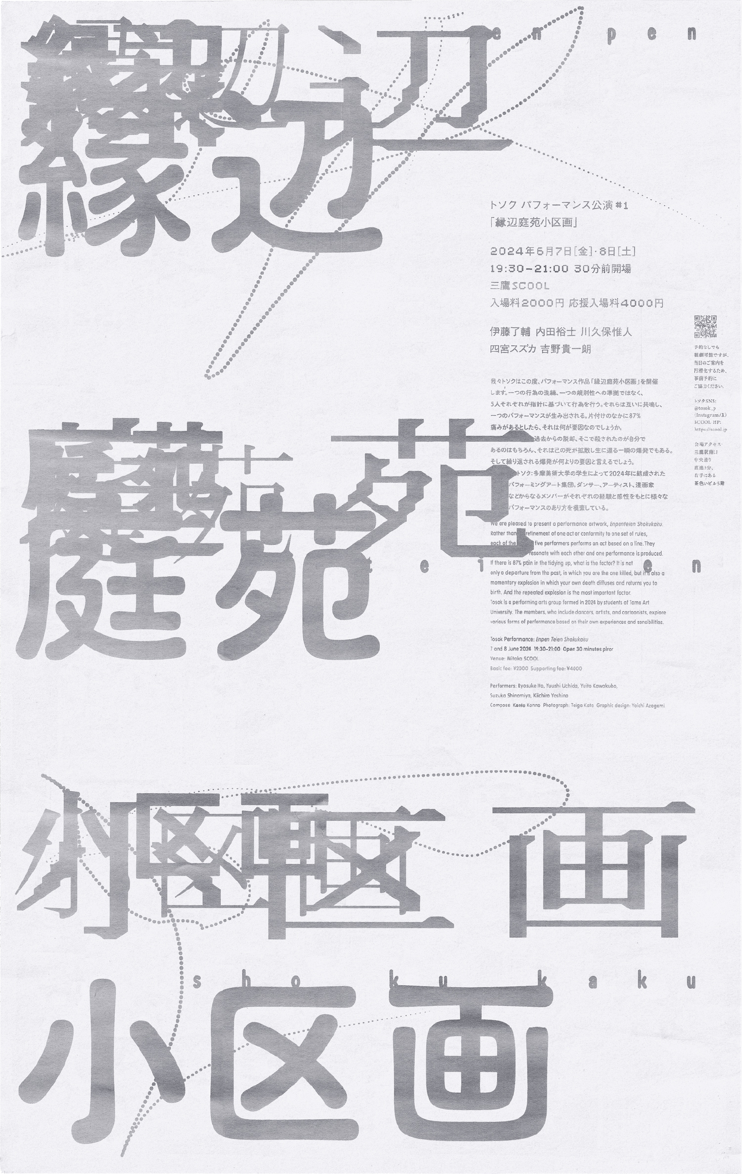 Enpen Teien Shokukaku (縁辺庭苑小区画; “A small plot in a peripheral garden”) was a performance by the student group Tosok from Tama Art University in Hachioji, Tokyo. The event took place at SCHOOL in Mitaka, Tokyo. I designed the poster and flyer for the performance, featuring a layout that mixes an extensive variety of fonts.