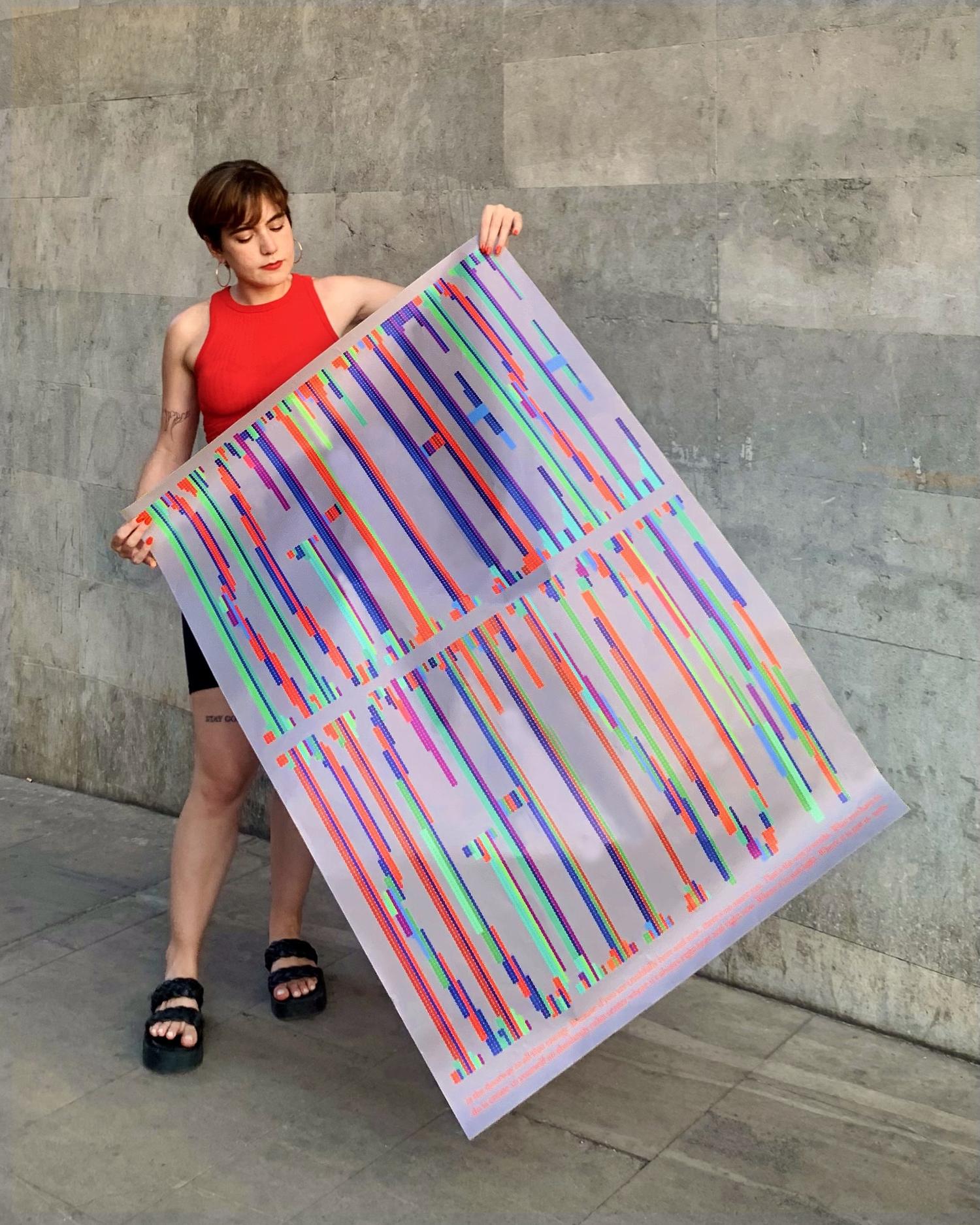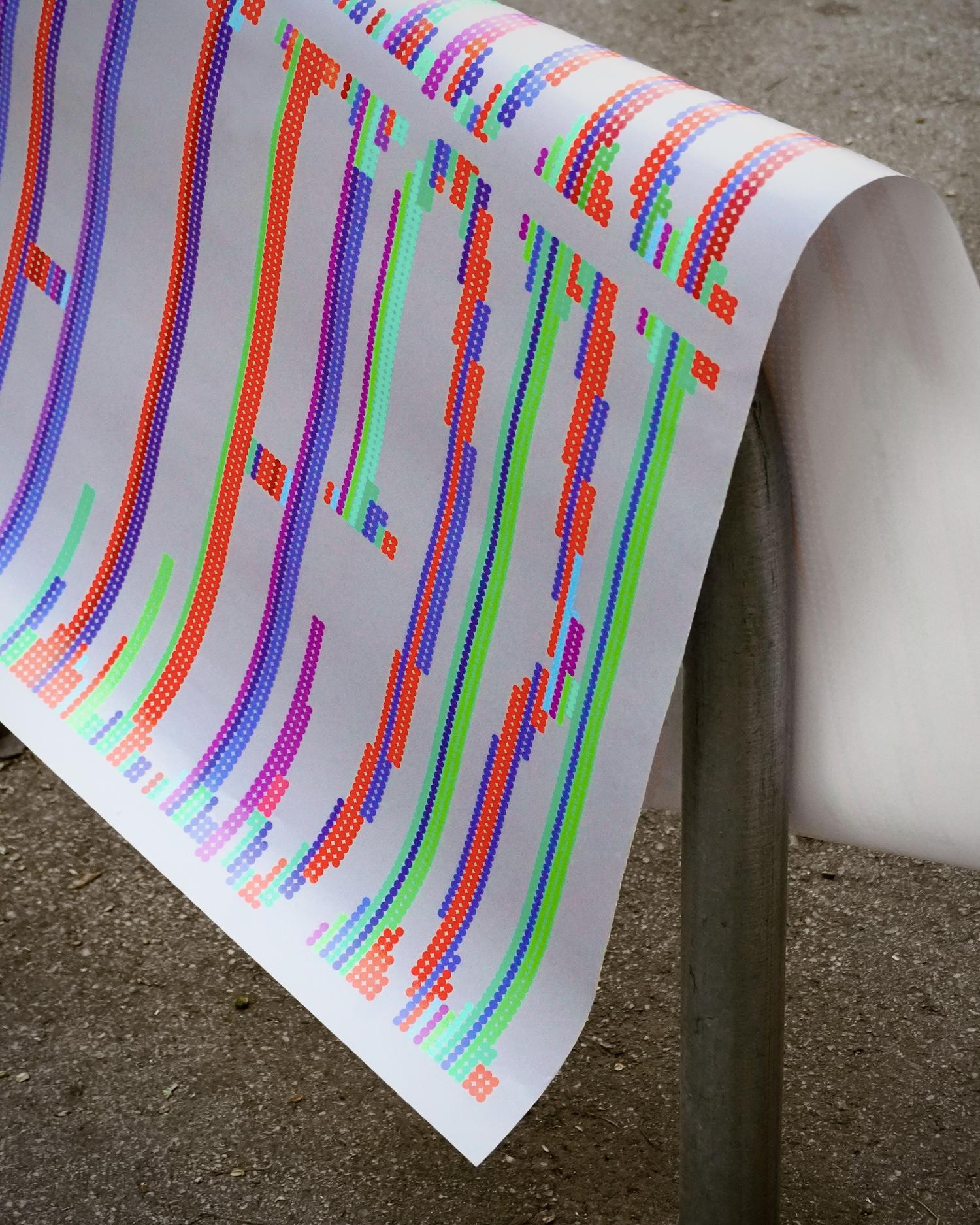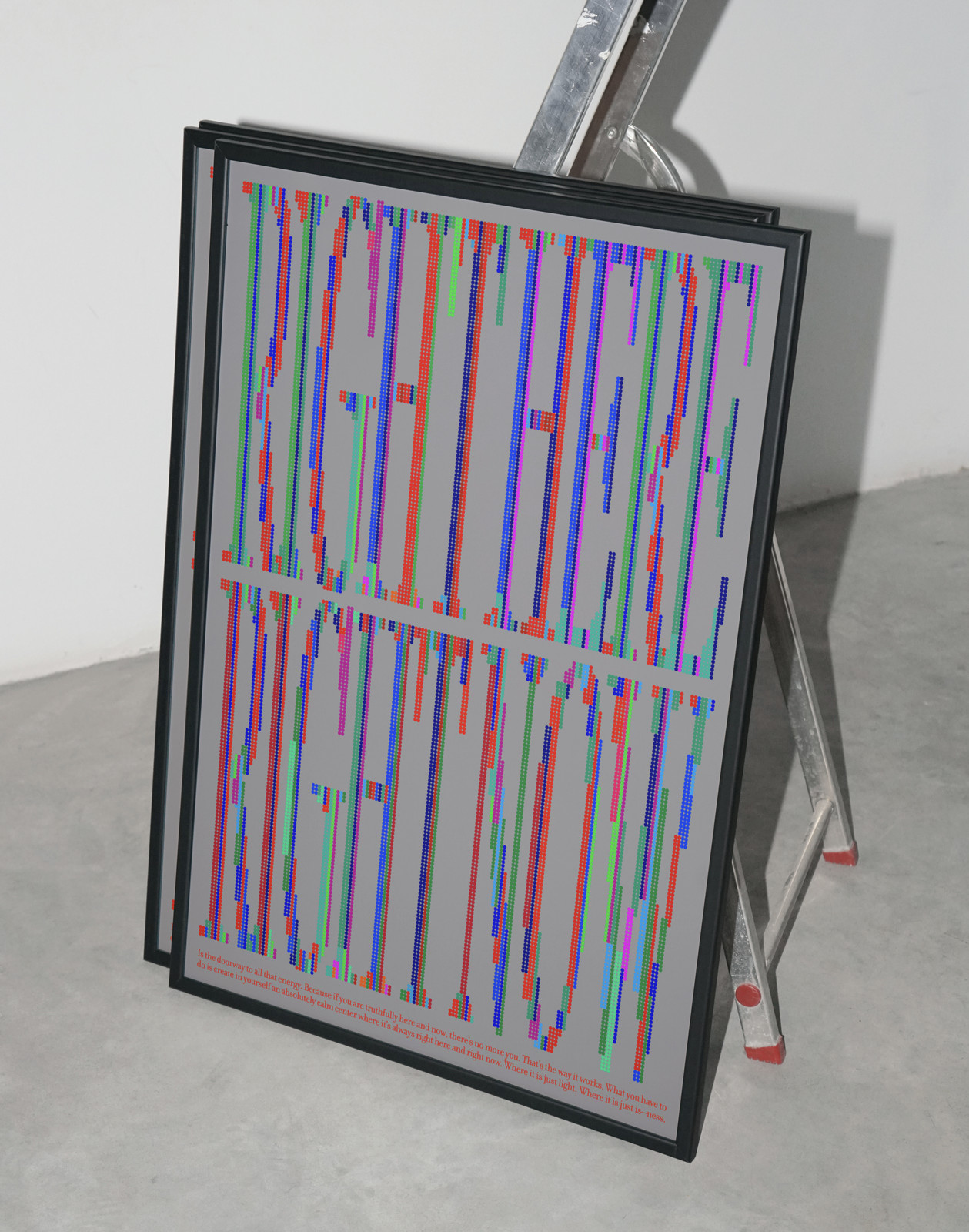 At the lower edge of the composition, two lines of text run horizontally across the design. This typographic element reinforces the conceptual message while introducing a chromatic counterpoint to the dominant vertical structure.