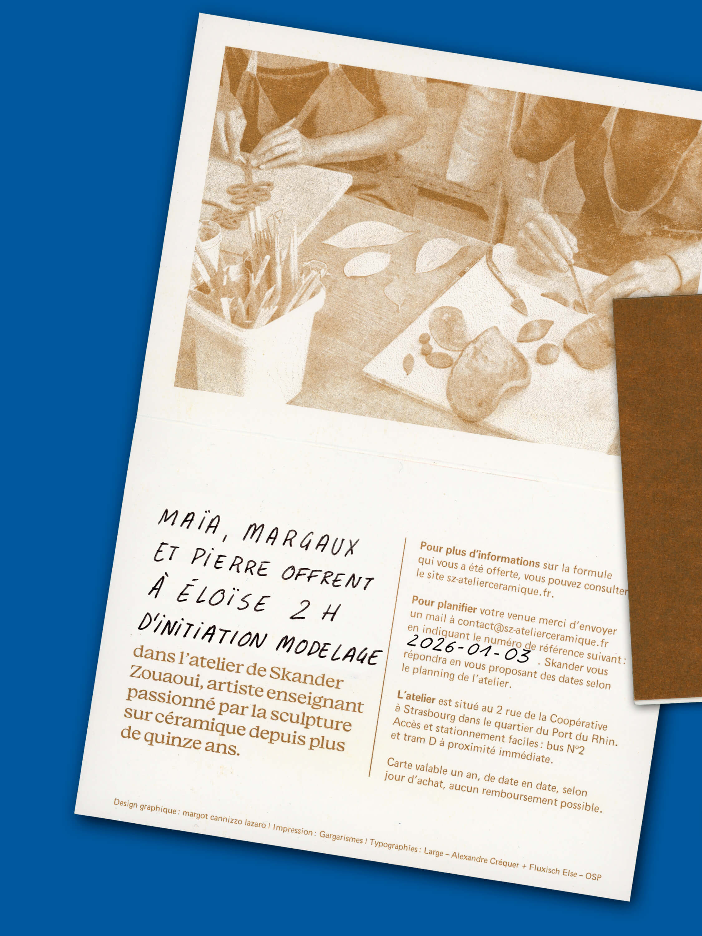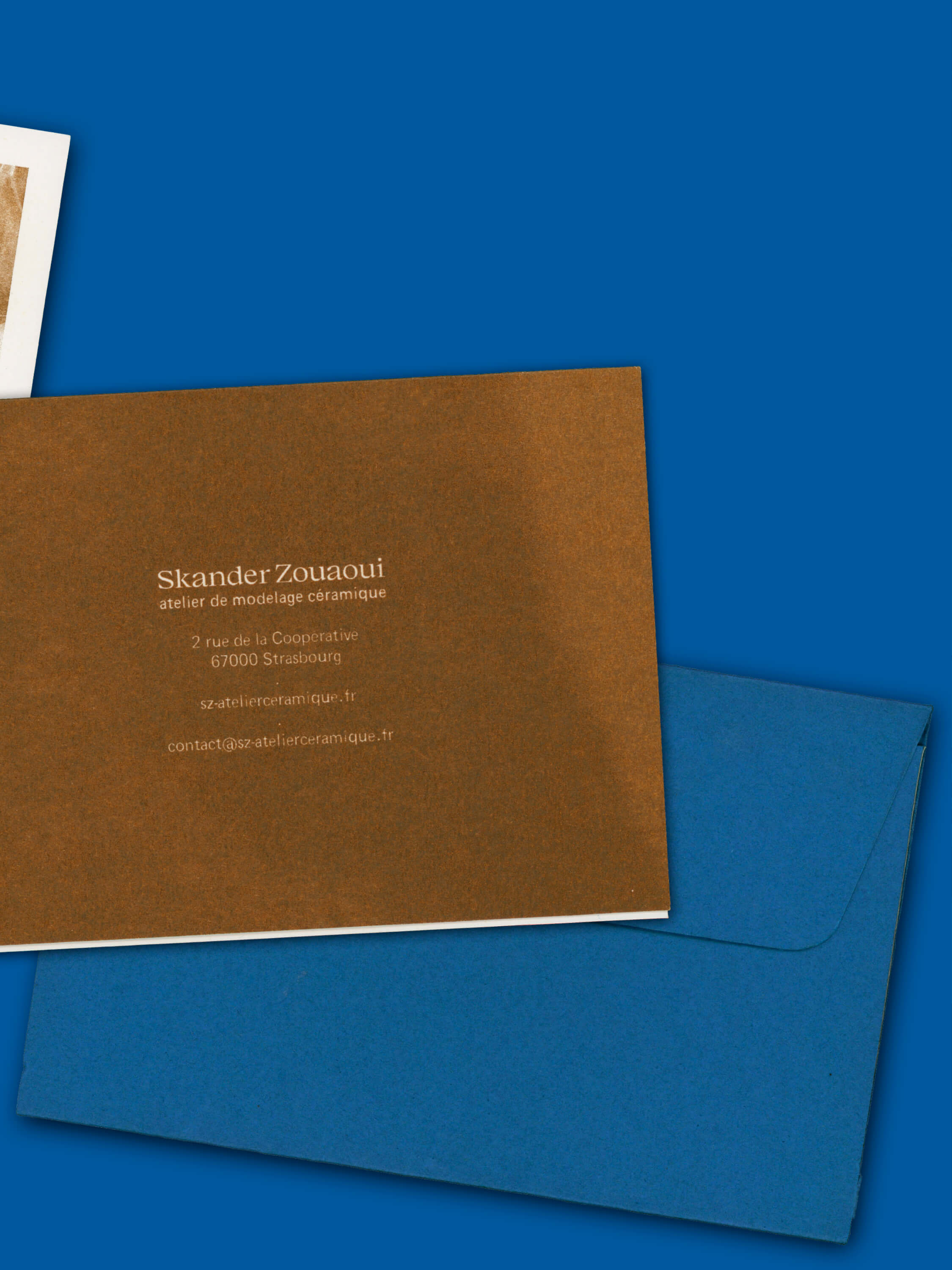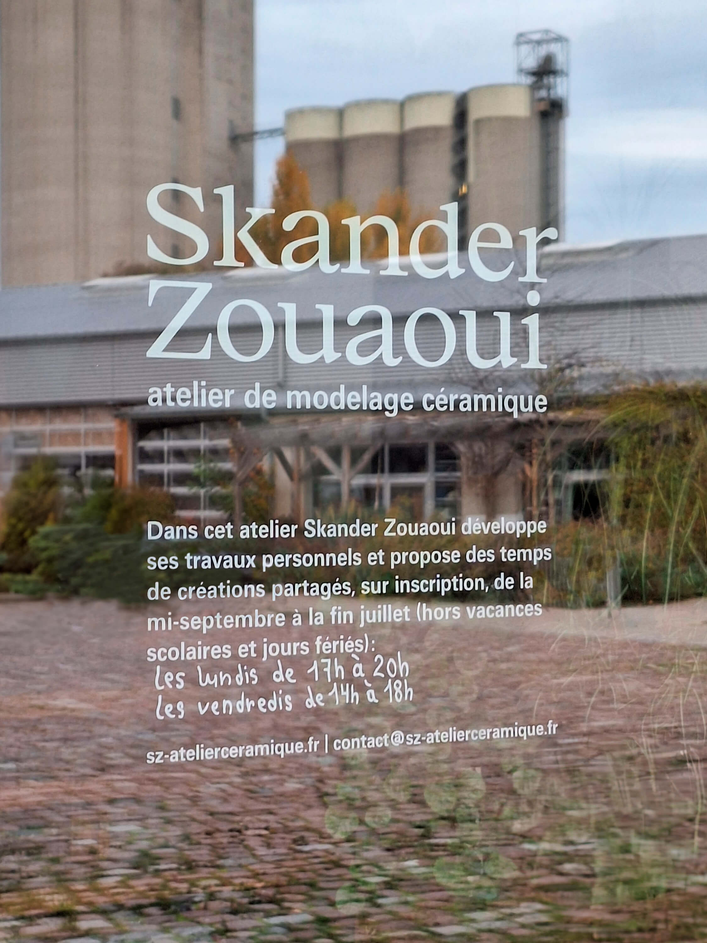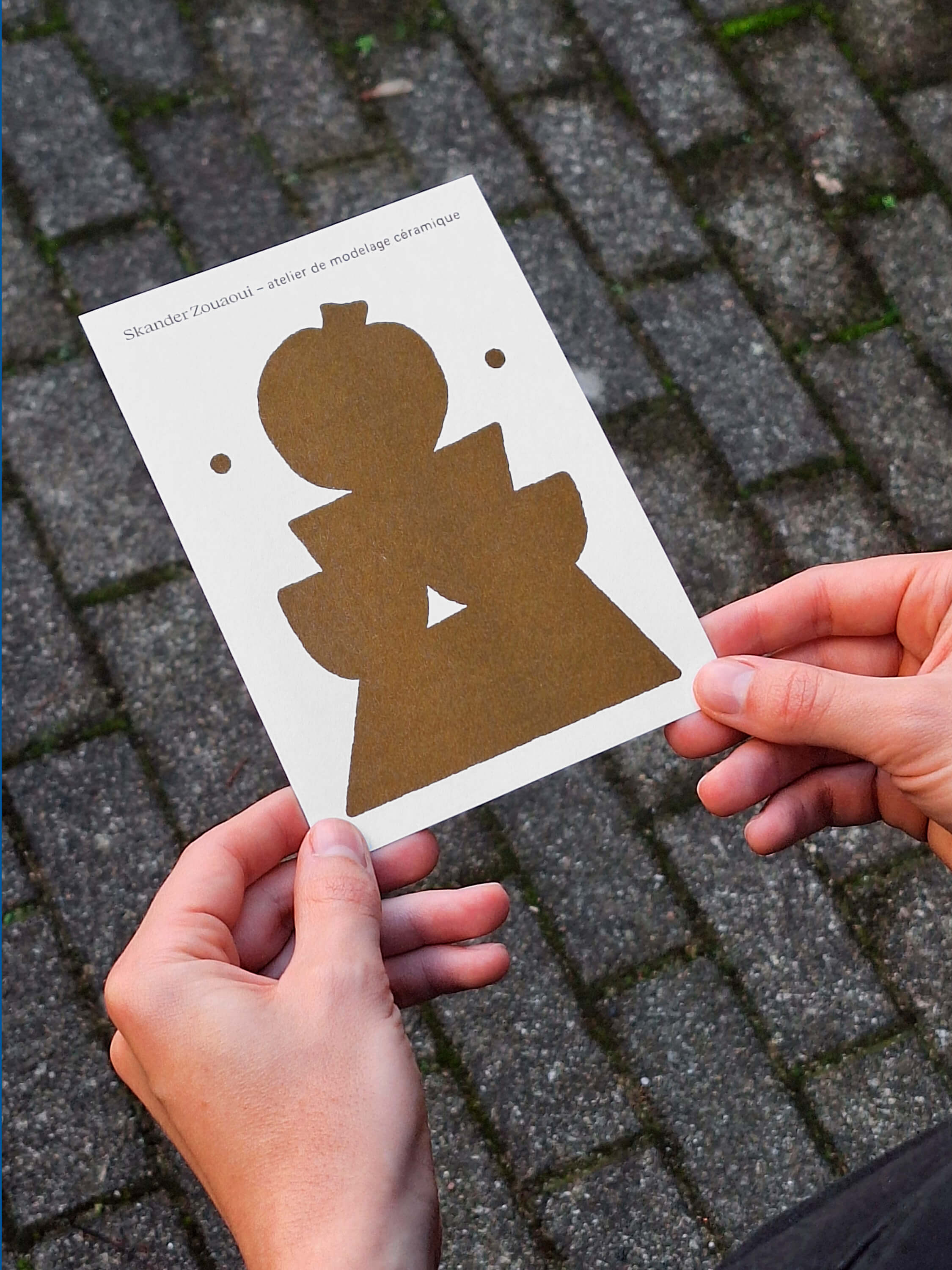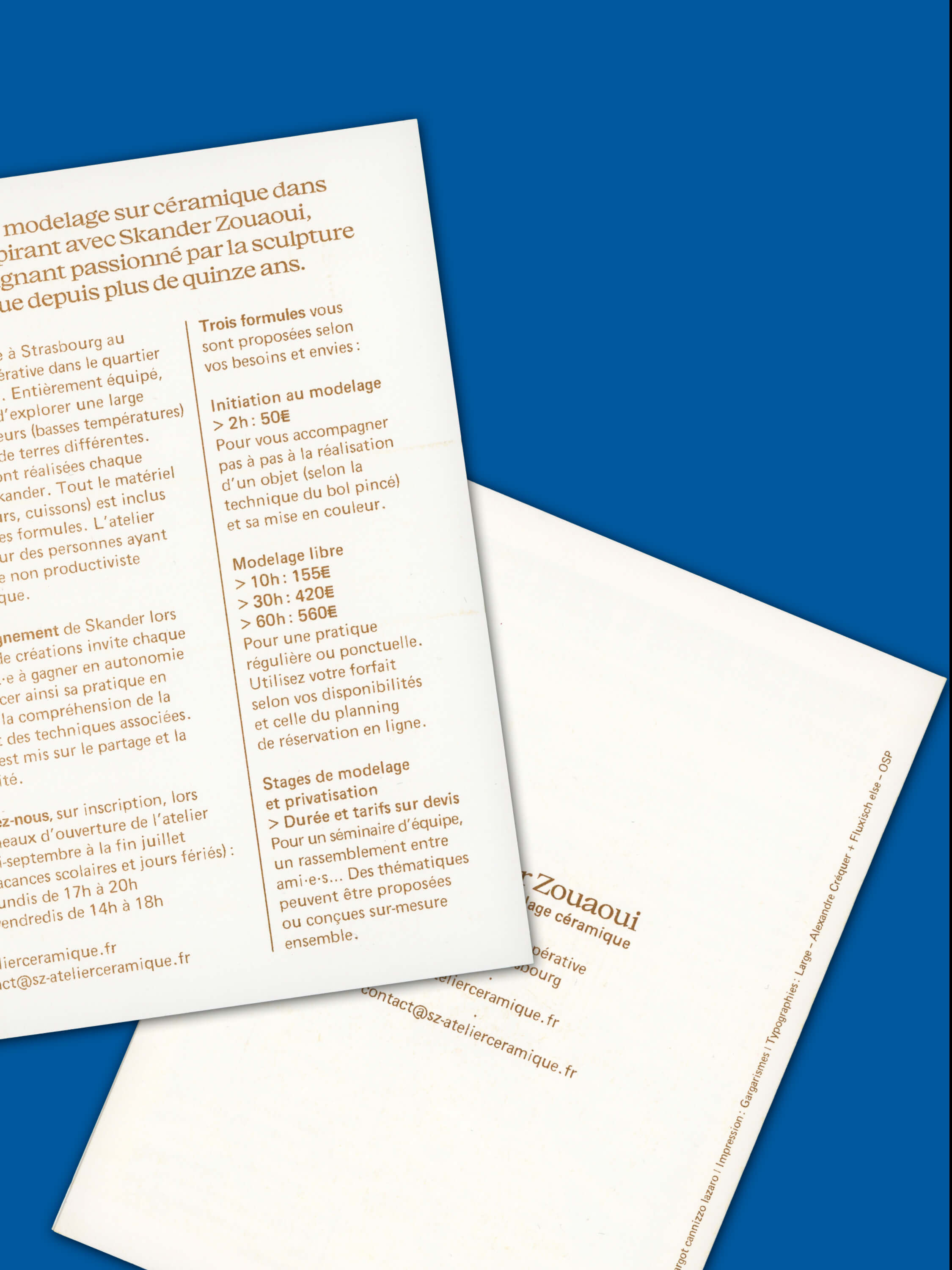 Designed in 2025 for the ceramic artist and educator Skander Zouaoui, this visual identity captures the elegant and collaborative atmosphere of his workshop located at Strasbourg’s Port du Rhin. The graphic identity is realized by Margot Cannizzo Lazaro and features a new logotype, a public signing on his workshop, and Riso printed communication supports.