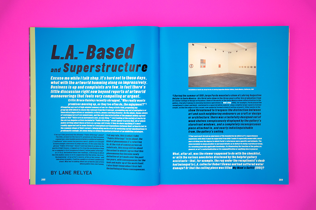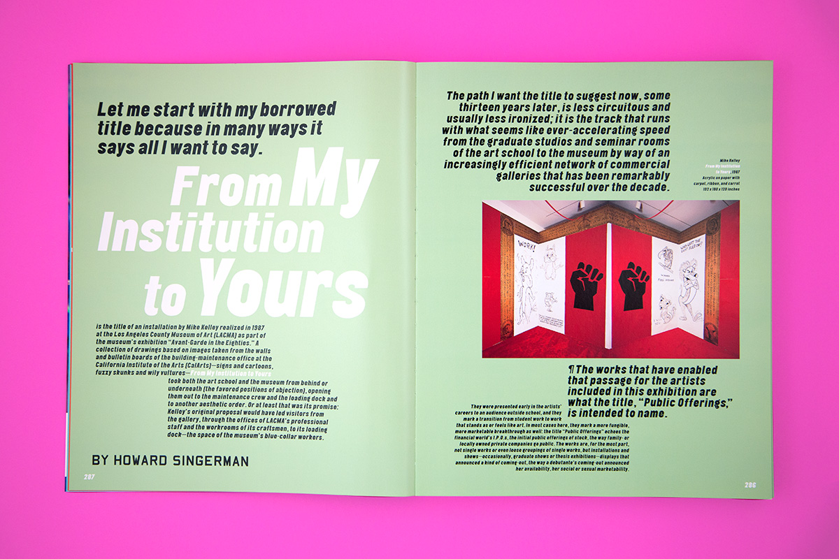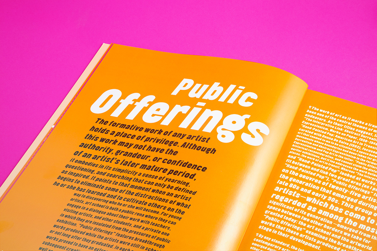 This catalogue accompanied the exhibition Public Offerings, at the Museum of Contemporary Art, Los Angeles, April – July 2001. The essays and picture captions in the book were set in Elephant Black Italic.
