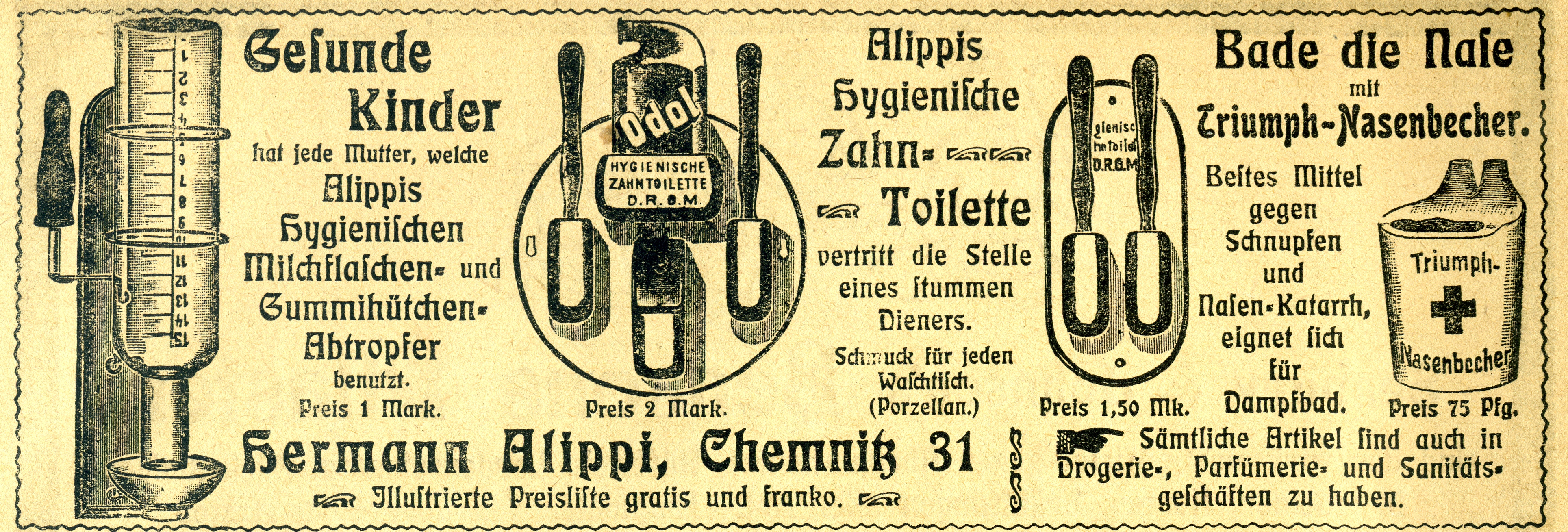 The Alippi company was established in 1877 as a specialist store for rubber goods and bandages. While founder Oskar Felix Alippi dedicated himself to the development of a seamless rubber hose, his wife Agnes Elisabeth took over the business side of things. In 1908, around the time this ad was issued, she ran the store on Innere Plauensche Straße in Zwickau, Saxony, named “A.E. Alippi”. Hermann Friedrich Alippi (their son?) was in charge of the manufacturing business in nearby Chemnitz.
