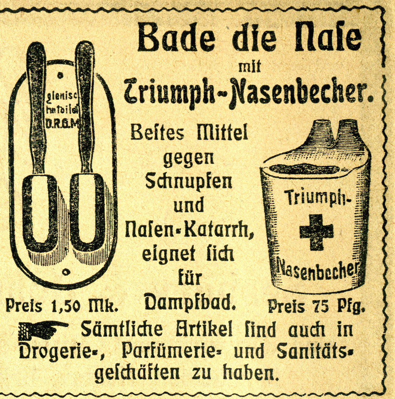 Eckmann-Schrift was first cast in 1900 by the Rudhard’sche Gießerei in Offenbach, which from 1906 on was known as Gebr. Klingspor. In 1902, a bolder weight was added. This ad uses the original style, with its double hyphen, long s (ſ), and ligatures for ch, ck and tz (in “Chemnitz”, but not in “benutzt”). The ornaments are part of the typeface, too, while the manicule was not. “Triumph-Nasenbecher” is set in Carola-Grotesk (Berthold, 1896).
