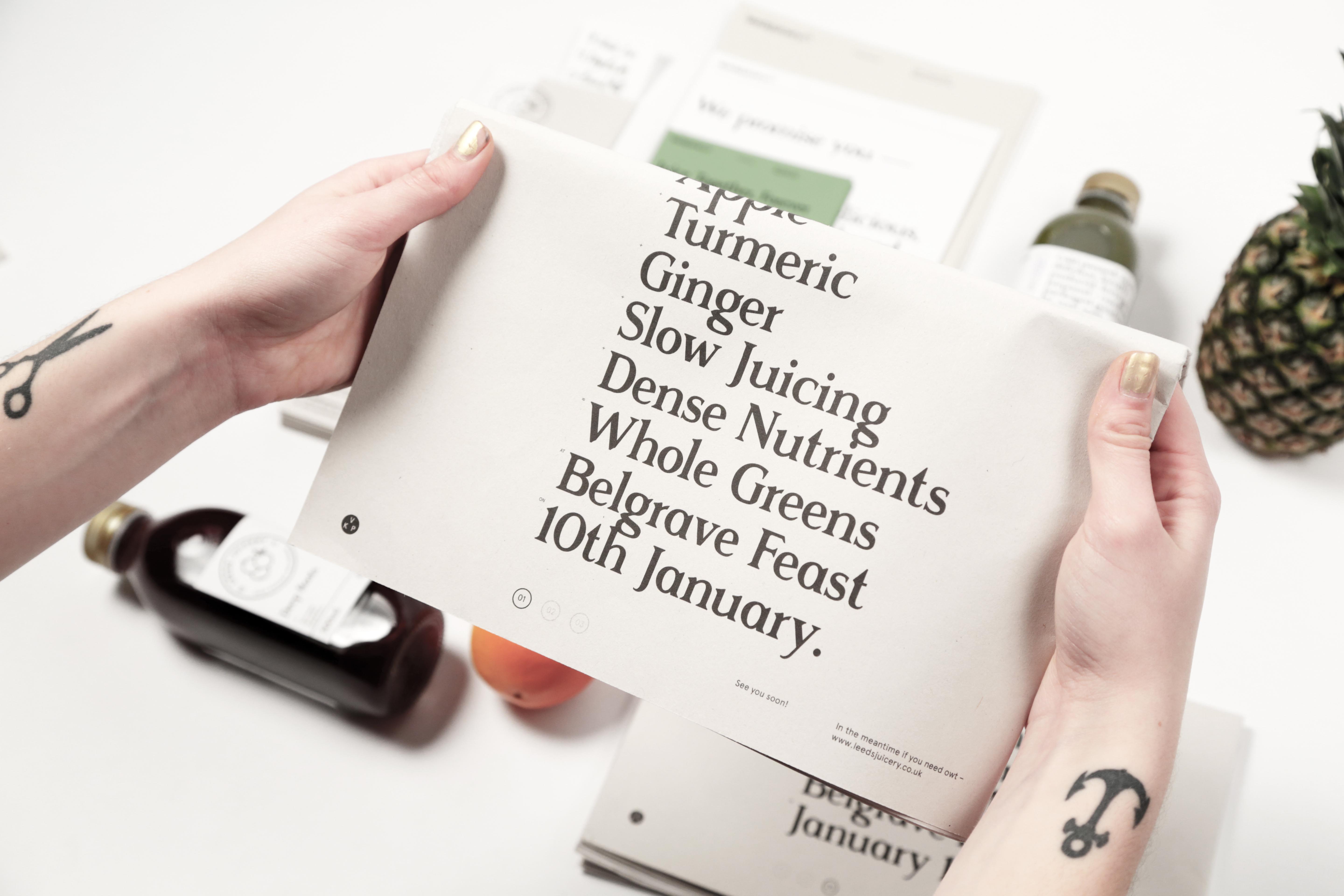 Leeds Juicery Branding Contributed by Daniel McQueen (TDF) on Feb 27th, 2015. Artwork published in 2014. License: All Rights Reserved. Branding project for Leeds Juicery (UK) using Rasmus Bold. License: All Rights Reserved. Source: www.behance.net Abbas Mushtaq & Leeds Juicery. License: All Rights Reserved. License: All Rights Reserved. License: All Rights Reserved. Typefaces More about RasmusGet Rasmus Formats Packaging (2441) Branding/Identity (8457) Booklets/Pamphlets (2399) Topics Food/Beverage (3061) Health/Fitness (882) Designers/Agencies Abbas Mushtaq (1) Greta Madline (1) Tagged withjuice (27)bottles (459)tabloids (12) Artwork location United Kingdom (3294) Leeds (34) In SetsBOOKLET (Batool Almosawi) (8)TYPOGRAPHY (jin seung jang) (4)Stuff (Tom Lucas) (10)eBook (Bernardo Sande) (10)Booklets/Pamphlets (Haze Ryu) (10)LOVE! (Zoe Moskovic) (126) Post a comment Name Email – will not be published Website Your response Submit Comment More Rasmus in use O tom se nemluví2014Štěpán ProkopContributed by Markus John Les Merveilles de la Mer (rebranding proposal)2019José LabakiLabaki StudioContributed by Labaki Studio Wetterau Whisky2016Atelier PARTUM. SammetContributed by Markus John Sponsor More in Health/Fitness Death and Design by Alexander Winkelmann2017Alexander WinkelmannContributed by Alexander Winkelmann Dr Markus Roganc. 2019ZwuppContributed by Frode Helland (Monokrom Skriftforlag) Eighth Day2021Underline StudioContributed by Production Type The Kay Pilates Studio2023Off-The-GridContributed by Olivia Wood More in Packaging Kodak Pleaser instant camerac. 1977unknownContributed by Florian Hardwig Spielbox game compendiumc. 1985unknownContributed by Florian Hardwig Moog Mavis2022Erik PedersenEmory BrandonContributed by Erik Pedersen Kappellenhof 5 wine collection2024Studio OedingContributed by Franziska Weitgruber Staff Pick More Fonts In Use Georges Perec books, Modernista edition2017Lars SundhContributed by Love Lagerkvist Staff Pick The Wire magazine, 2012–2012Ben WeaverContributed by Swiss Typefaces Staff Pick Lande Architects visual identity2020Studio GangplankContributed by Ganplank Staff Pick The Rachel Papers by Martin Amis (Alfred A. Knopf)1974Ray CruzContributed by Chris Purcell Staff Pick