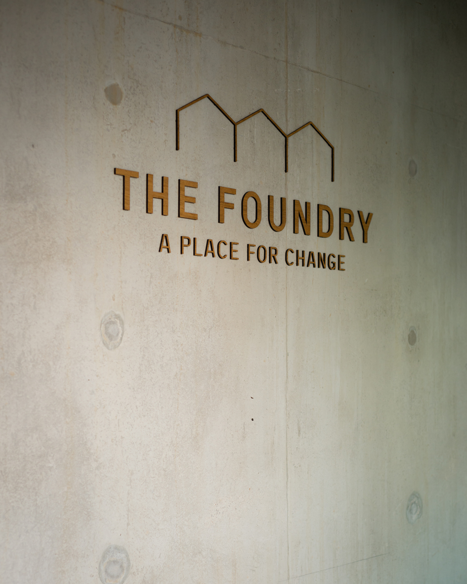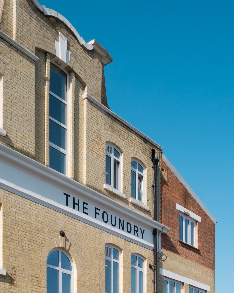 Exterior building signage displays The Foundry name as anodised steel lettering elegantly on the front of the new building, while at the back, on the old building, the name has been painted onto the surface which looks almost like an original feature of the building.