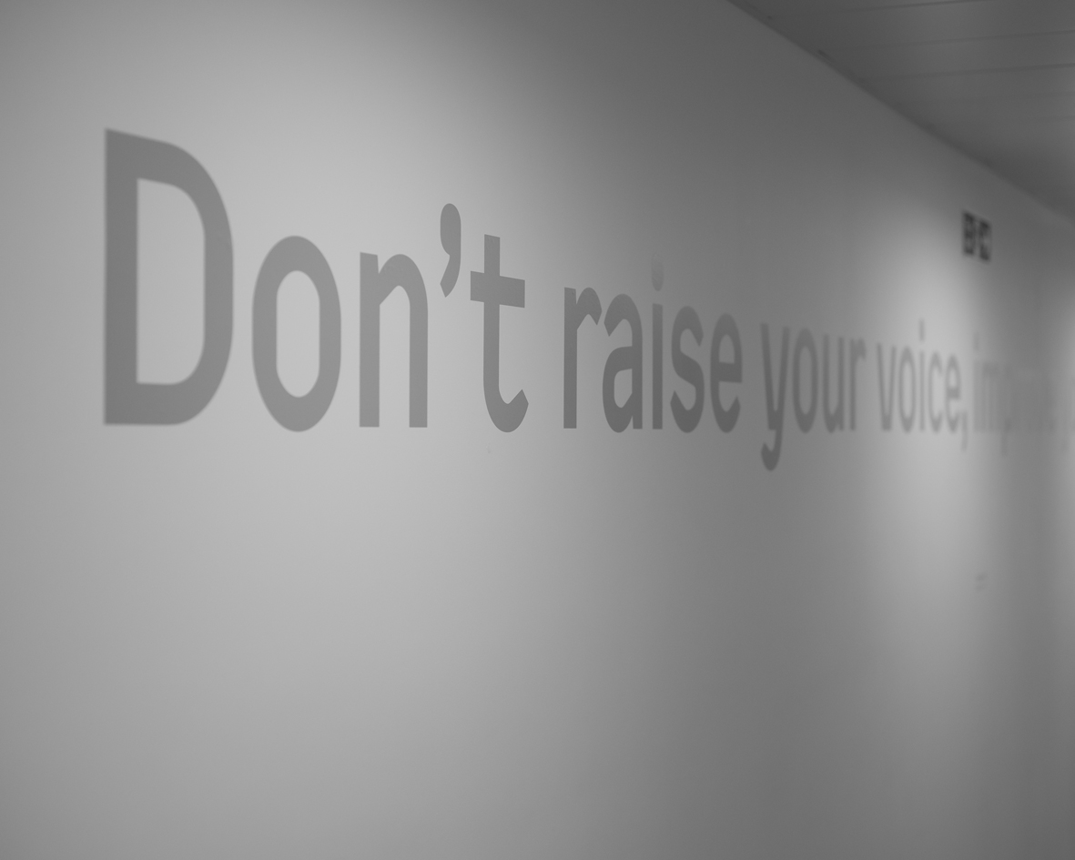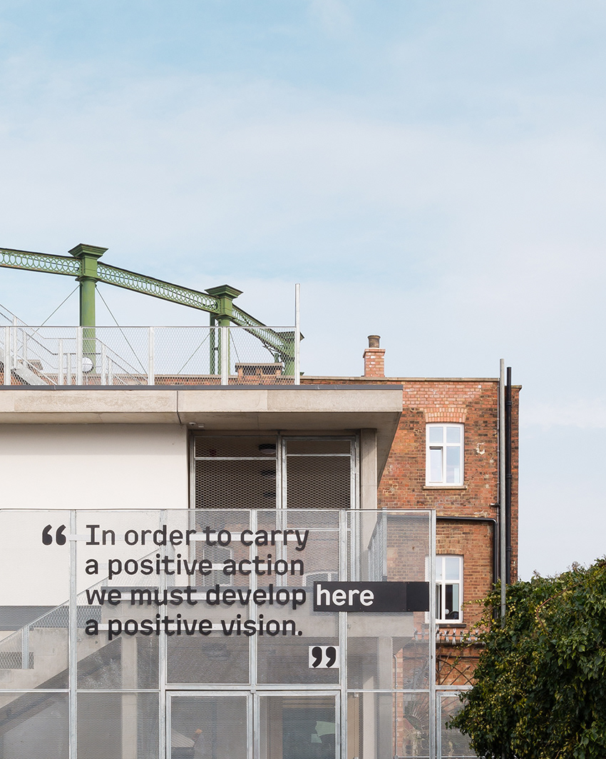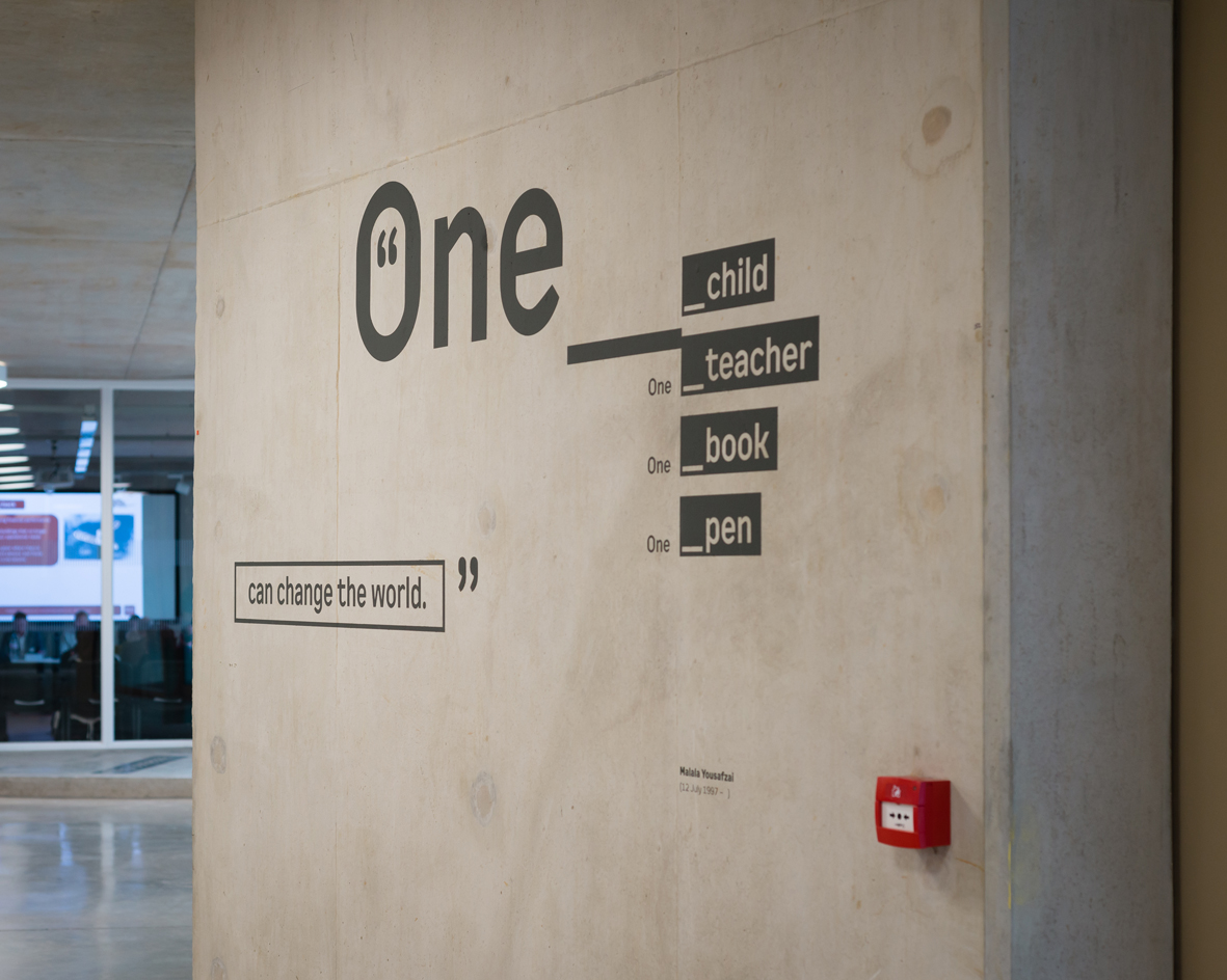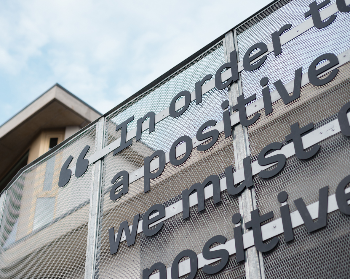 Quotations appear throughout the building on both the concrete surfaces and white walls to create a narrative presence that reflects the place ethos. A large exterior metal anodised lettering quotation is displayed on the stairwell grill and reflects the nature of what is done ‘here’.
