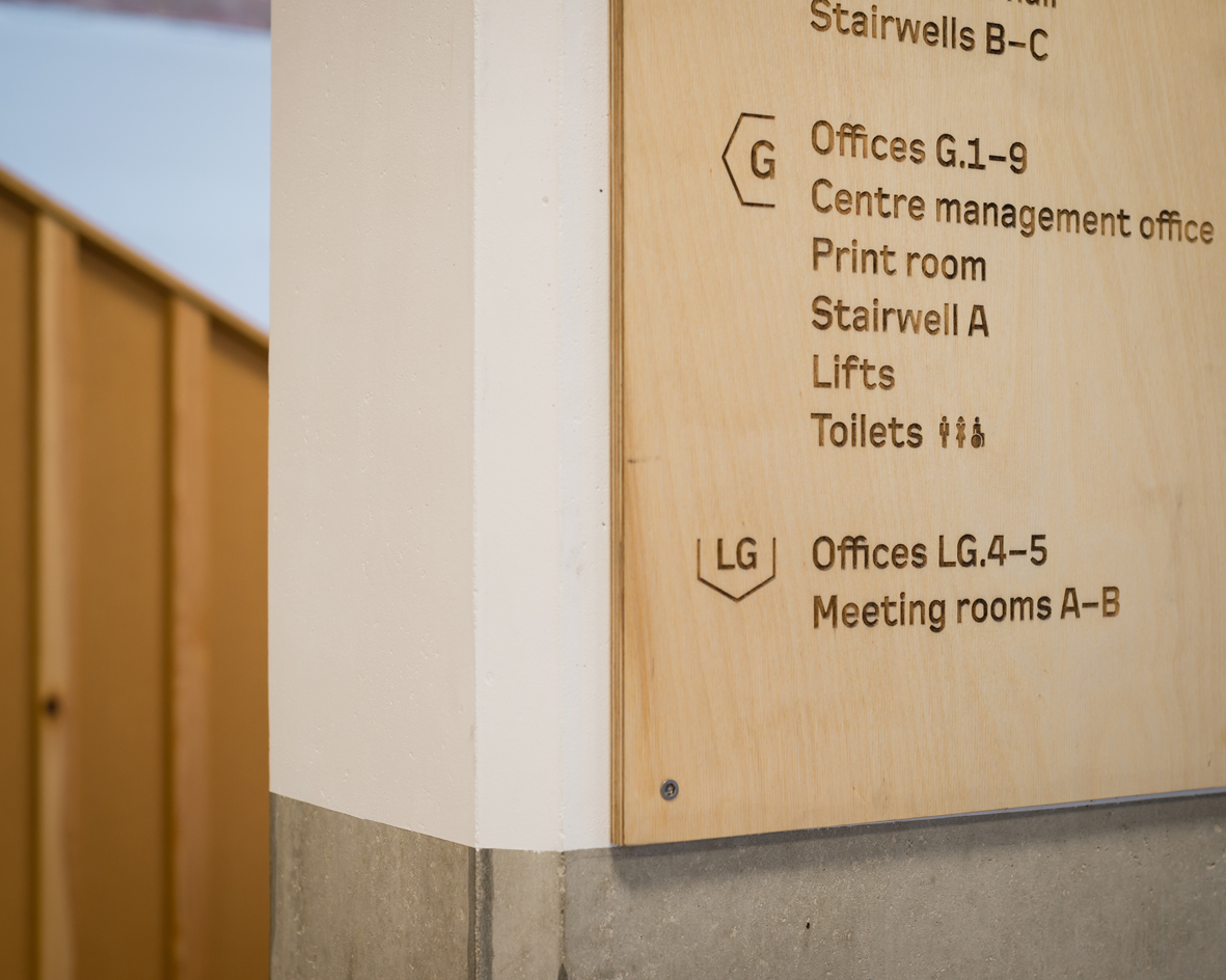 Wanting to create sympathetic design solutions to the strong elegant lines of the well-designed building and use of materials, the wayfinding signage reflects the wooden surface details, where directional information has been laser-etched into plywood panels and mounted directly onto the wall surfaces.