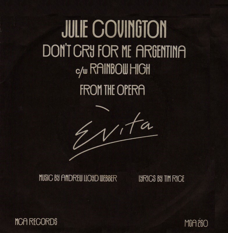“Don’t Cry For Me Argentina” by Julie Covington from Andrew Lloyd Webber and Tim Rice’s concept album Evita was an international hit in 1976. The album was adapted for the stage in 1978. The single was a hit for a second time when Madonna covered it in 1996 for a full length motion picture adaptation of the play.